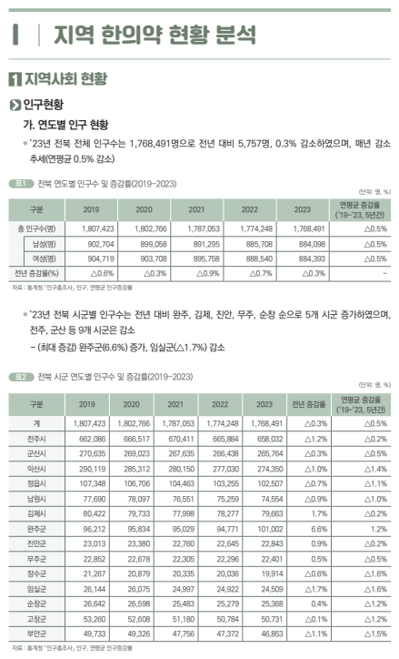 - (인력) 지역 내 활동 중인 의료종사자수(의사·약사 등, 간호사 및 기타인원), 병의원 종사 한의사수, 병의원 종사 한약사수 등 파악