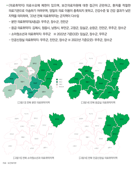 - 취약계층 현황 : 장애인 인구수, 독거노인 인구수, *중증 장애인 등록자 비율, 기초생활보장 대상자 비율, 건강보험료 1분위(하위20%) 비율 등 참고하여 지역 내 전체 인구대비 취약계층의 상대 비중 파악