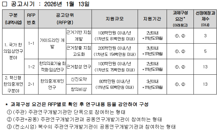 2026년도 제1차 한의약혁신기술개발사업 신규지원 대상과제 공고 | |||